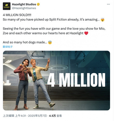 Hazelight工作室也在社交媒体平台上分享了这一令人振奋的消息,并对全球玩家的支持表示感激。该工作室表示,这一销量成绩对于他们来说既是巨大的肯定,也是未来创作的动力。