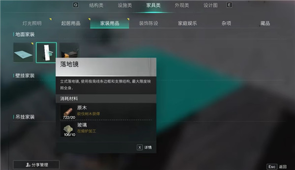 当你成功购买了蝶变道具后,接下来需要做的是通过落地镜来实际完成性别的转换。落地镜是一个特殊的家具类道具,玩家可以在道具栏中找到它。制作落地镜时,需要消耗一定的资源,具体来说是20块木头和10块玻璃。