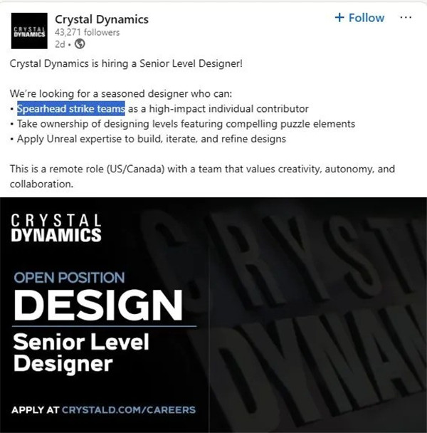 据悉,水晶动力正在为一款尚未对外公开的游戏招募一名高级关卡设计师。根据招聘公告的描述,这一职位的候选人将成为“极具影响力的贡献者”,并将参与一个被称为“突击小组”(Strike Team)的开发团队。
