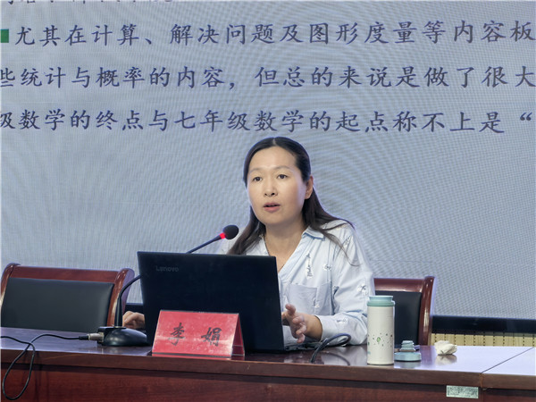 李娟主任为本次研讨活动带来了主题为小、初数学衔接教学的价值、路径和策略的精彩讲座,为教育者们提供了深刻的理论指导和实践策略。李主任从课标、教材、学情、教情等多个角度切入,全面论述了数学衔接教育的深远意义。