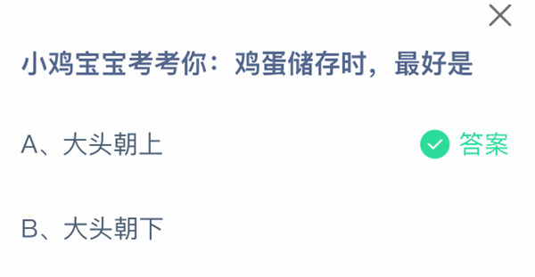 2、题目:小鸡宝宝考考你:鸡蛋储存时,最好是