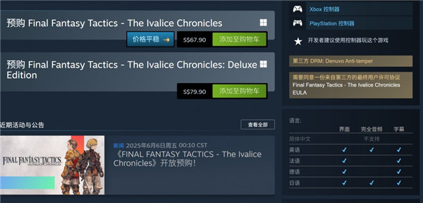 Square Enix 宣布,FINAL FANTASY TACTICS - The Ivalice Chronicles现已开放预购,Steam 国区将于 2025 年 10 月 1 日正式解锁。标准版售价 298 元,豪华版 348 元,暂不支持中文。