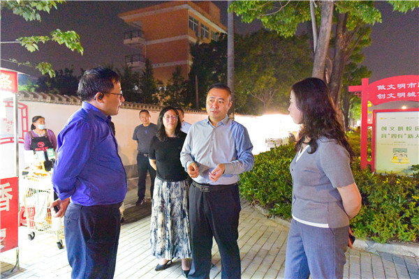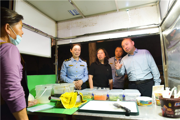 在流动摊点疏导区域,检查组详细核查了摊主的健康证、公示牌情况,了解了煤气瓶使用及食材采购、存储等环节。针对现场发现的摊主未佩戴口罩、公示卡位置不规范、疏导区划设不及时等问题,相关部门进行了现场沟通和整改指导。