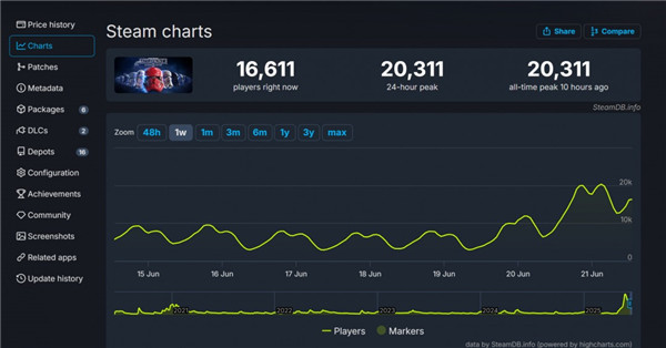 自2017年11月由EA发售的3A大作星球大战:前线2至今,虽然已经过去了近8年,但这款游戏在Steam上的热度依然不减。近日,游戏的在线玩家数再度突破历史记录,仅10小时前,Steam上星球大战:前线2的同时在线玩家数突破了20,000人,达到了20311人的峰值。目前,在线人数依然保持在16611人左右,显示出这款游戏在玩家中的持久魅力。