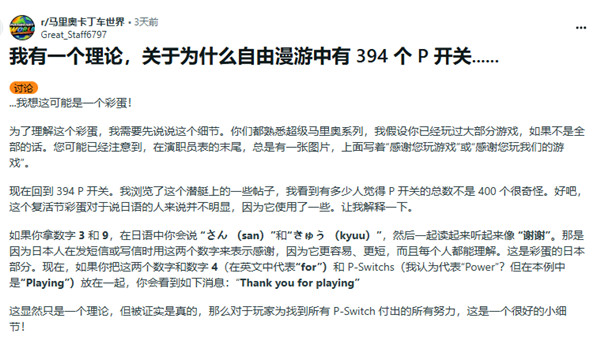 在Reddit上,玩家Great_Staff6797提出了一种有趣的理论,认为这个数字394可能并非偶然,而是任天堂故意埋下的一个隐藏彩蛋。如果懂一点日语,或许能从中发现一丝玄机。他解释道,在日语中,数字“3”读作“さん(san)”,数字“9”读作“きゅう(kyuu)”,连读起来的发音与英语中的“Thank you”(谢谢)相似。日本人常常用这两个数字组合来表达感谢,既简洁又易懂。