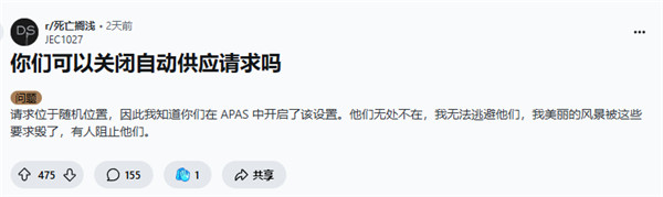 “自动补给请求”是由APAS(自动物资请求系统)驱动的一项新功能,玩家可以通过该系统在任何地方自动发起物资求助。理论上,这项功能的目的是为了让玩家能够更便利地获取所需物资,同时减少手动发起请求的频率,从而提升游戏内的互动效率。这一机制原本可以增加玩家之间的协作和“羁绊”感,尤其是在这类需要长期建设和相互帮助的开放世界中,提供了一种便捷的社交方式。