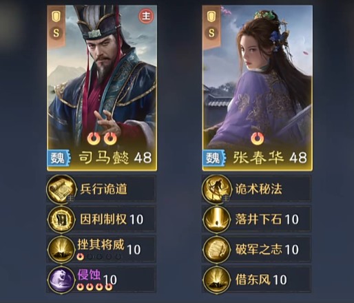 虽然在这里带来的是法术输出的一个提升能力,但是后期他在他的挫其将威之后还可以提升对于对面将领的一个削弱效果,所以在这里的司马懿强度上面来说的话,他也是属于可以给曹操带来加成的一个角色,张春华可以带的则是借尸还魂以及君心我心,在这里战斗当中,这两个技能可以增加张春华各项属性效果,可以带来的中毒持续输出能力也会更强,而且可以在层数叠加足够的时候也为队伍带来足够的输出提升。