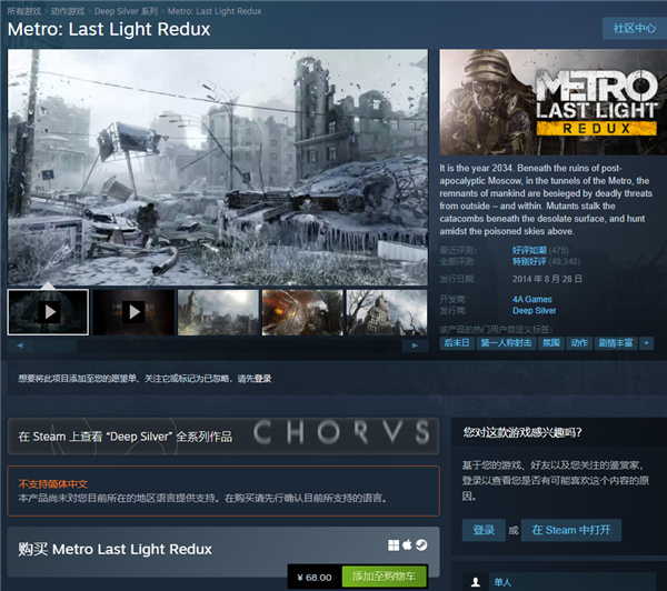 地铁最后的曙光游戏本体Steam售价68元,完整版是之前从Steam商店下架的游戏版本。所以如果这一次的十周年活动不领取,那么错过就很可能是绝版了。游戏不支持简体中文,有很多民间汉化,不妨碍正常游玩,需要大家动动自己的小手去网上找。游戏预计将于5月19日凌晨1点左右开放领取,敬请期待。