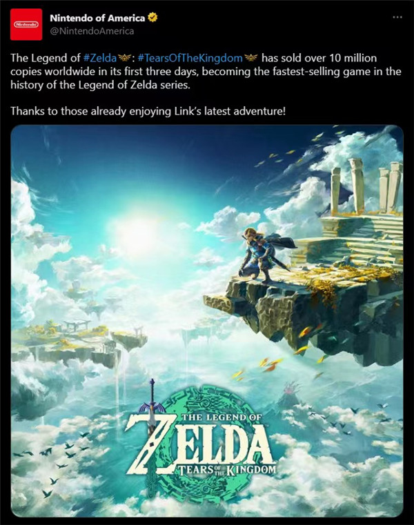 根据任天堂官方的最新消息,塞尔达传说王国之泪发售首周仅3天全球销量就超过了1000W份,其中日本本土224万份,美国超过400万份,创造了塞尔达系列的历史记录。