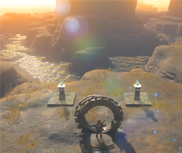 8、岛屿的左上角有一个圆环,先去互动,然后水位下降,在中央山体的侧面会露出一个洞穴,进去用弓箭和炸弹花开门。