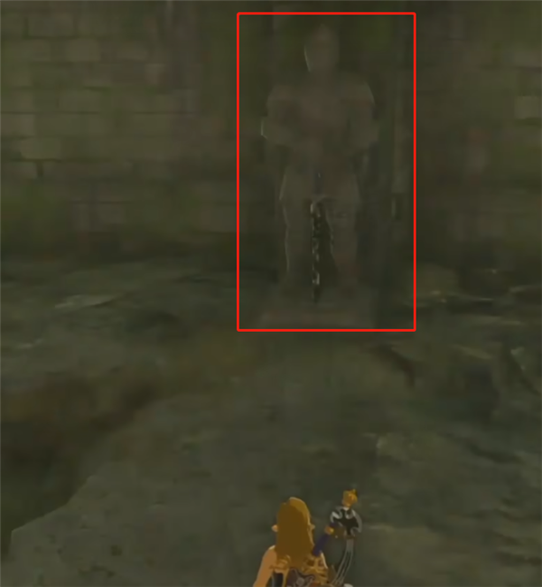 2、在一楼可以看到两尊骑士雕像,把附近生锈的双手剑用究极手放到他们手里,就会开启石板