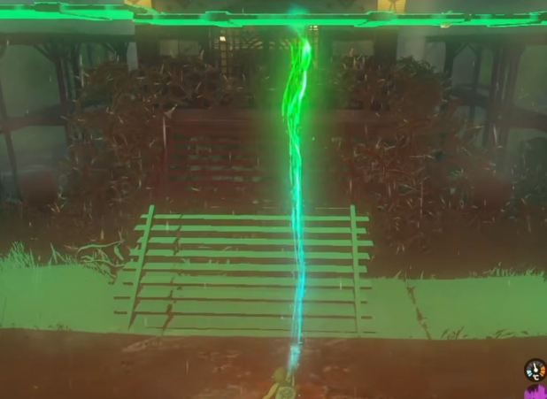 首先用木板搭建一个长棚,放在鸟瞰点门口,这里有很多荆棘藤蔓,但是因为是雨天,如果直接用火附魔过的箭矢烧藤蔓,火势会被雨水浇灭,但有了棚子之后就可以实现了。