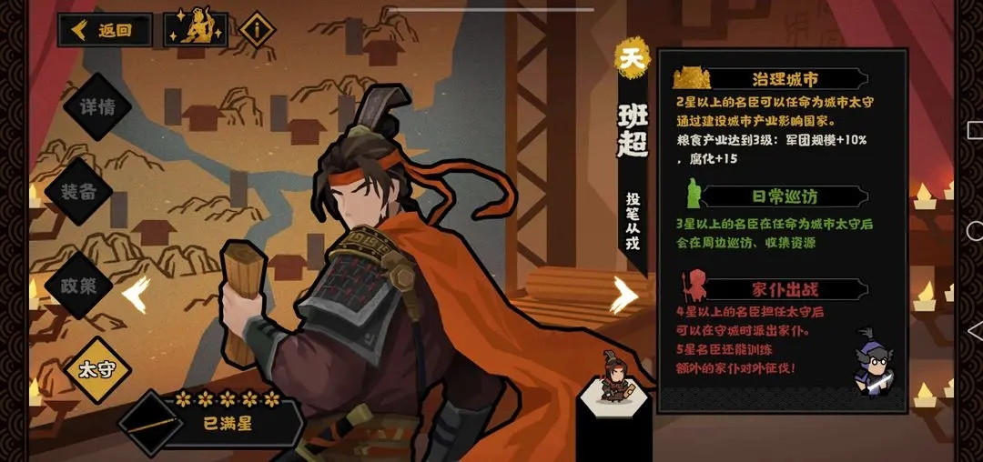 本身是非常强力的太守效果,触发容易(只需要粮食产业即可)且负面影响(高腐化)对于班超来说算是正面的补正(能够增强总大纲政策)。
