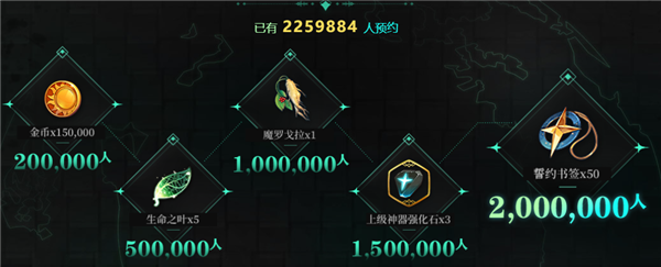 截止我发文前,游戏已有2259884人预约,超过了游戏前期的最高预约目标200W。所以我们能够得到的国服预约奖励一共有15W金币、生命之叶*5、魔罗戈拉*1、上级神器强化石*3、誓约书签*50。