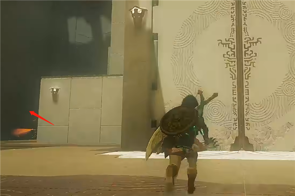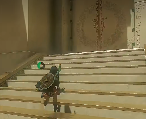 二、然后从这个位置通天术上去,再沿着梯子爬上去。上去之后有一个“狗洞”,我们需要按下左摇杆的中心,让林克蹲着过去。
