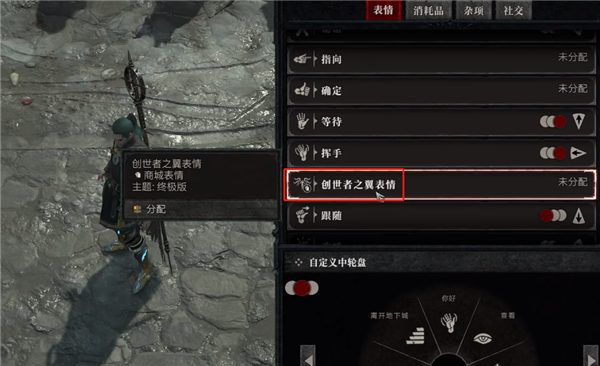 终极版预购的奖励里有一个专属表情-“造物主之翼”,我们需要进入游戏长按E,然后点击自定义界面,下拉表情栏就可以找到,非常帅气。