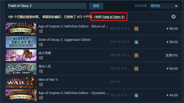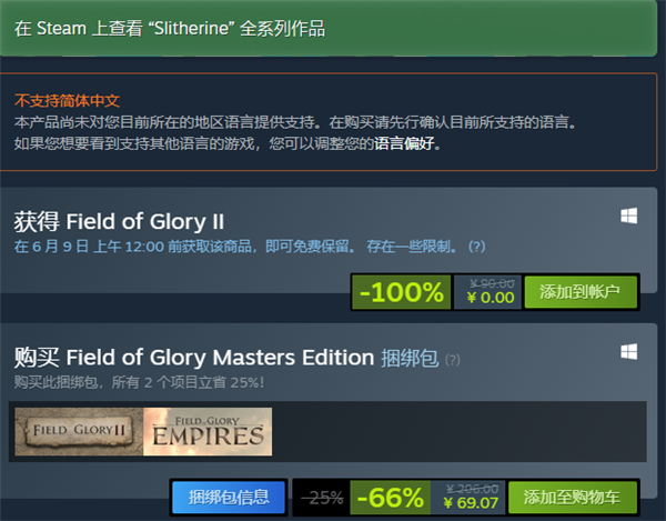2、登录Steam,在右上角搜索栏输入游戏英文名Field of Glory 2,进入游戏商店页面,下拉选择添加到账户即可立即入库。可以不玩,但是一定要有。游戏本身不支持中文,所以如果搜索没有找到,可能是受语言偏好限制。