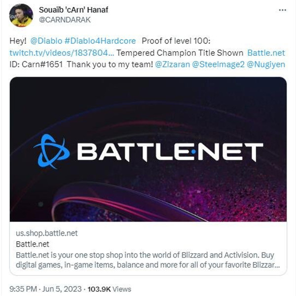 不到4天,暗黑破坏神4专家模式首个满级玩家出现!外服主播cArn_在推特宣布,自己是首个暗黑破坏神4硬核模式满级的玩家,游戏的社区经理Adam Fletcher在评论区中对他表示了祝贺,证明了该消息的真实可靠性。