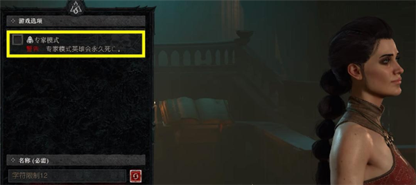专家模式可以在创建角色的时候选择,在我们捏完脸,输入人物名字上方的“游戏选项”里就能选择是否开启专家模式。专家模式下的英雄如果在战斗中死亡,那将是永久死亡,无法复活,即存档无法继续。