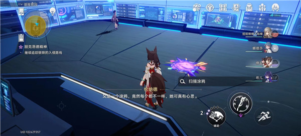2、和他对话得知需要我们去解码银狼留下的朋克洛德涂鸦。我们只要靠近涂鸦,然后点击互动即可扫描解码,了解涂鸦的信息。第一个涂鸦在黑塔投影后面的墙上,第二个涂鸦在去基座舱段的通道上。