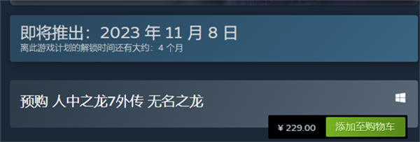 截止发文,如龙7外传无名之龙已经开放预购,目前只有标准版,国区售价229元,支持简体中文,后续的英雄版和传奇英雄版暂未推出。游戏预计将于2023年11月8日正式发售。