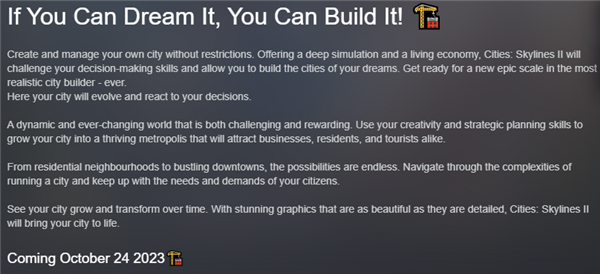 作为游戏历史上最受好评、最逼真的城市模拟建造游戏,城市天际线为全球玩家留下了难以磨灭的印象,并且经久不衰。而就在最近,城市天际线2确认将于今年正式发售。很多模拟建造的玩家都非常有知道游戏什么时候发售,我今天结合官方消息来告诉大家答案。