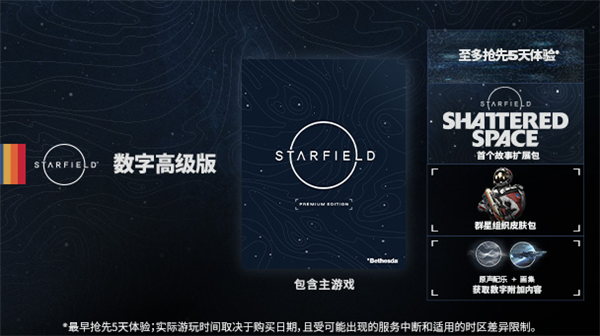 标准版只包括游戏本体,而高级版出了游戏本体以外,还有至多5天抢先体验的特权,的首个故事拓展包(Shattered Space Story扩展包)、群星组织皮肤套和原声配乐。
