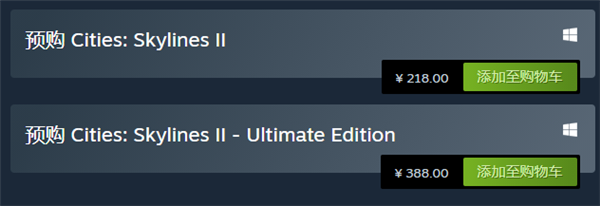 城市天际线2的标准版国区售价为218元,终极版为388元,相差170元。