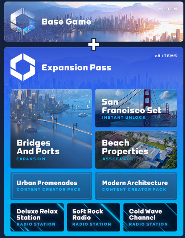 终极版除了标准版的游戏本体之外,还包含游戏的拓展内容通行证(涉及到后续8个DLC)。其中包含San Francisco套组、Beach Properties物件包 (2023年第四季度)、两个内容创作者包 (2024年第一季度)、Bridges & Ports扩展包 (2024年第二季度),以及将随上述三波内容推出登场的3个电台 (2023年第四季度、2024年第一和第二季度)。