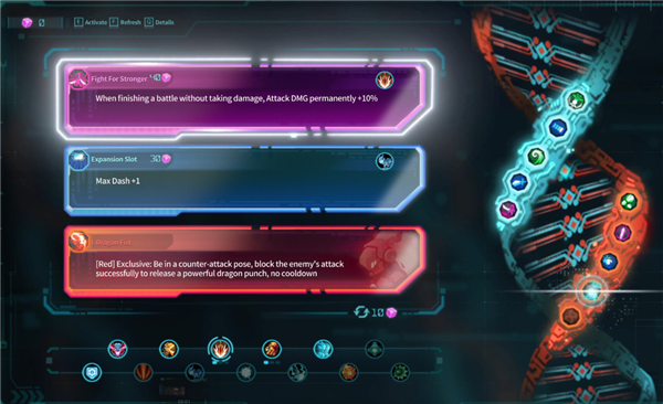 游戏中拥有轻度rogue的元素,玩家可以从超过23种各有特色的武器库中,选择不同的【武器设计】【动作编排】【技能词条特效】,来自定义自己心仪的武器,并通过DNA系统进化出机械人的专属能力,进一步增加构筑BD流派的乐趣。
