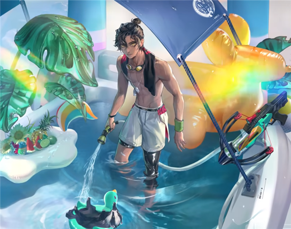 黑皮的狼獾露出他坚实的肌肉,穿着短裤,在泳池拿水枪逗弄身边的小蜜獾,旁边放着他的弩箭。小蜜獾躺在游泳圈里,看起来就很享受的样子。