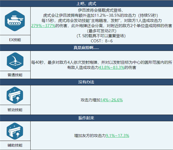 3、伊吕波是神秘属性的手枪角色,大招能够召唤虎式坦克,大幅提升角色攻击力,每15秒对单体敌人造成巨大伤害,并且炮弹还会分离,对周边的2个敌人再次造成伤害。