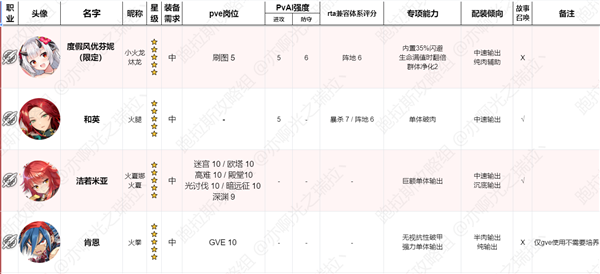 针对每个角色,都整理了对应的信息,包括昵称、星级、装备需求、PVE岗位、PvAI强度、RTA兼容体系评分、专项能力、配装倾向、能否通过故事召唤获得等,非常全面。