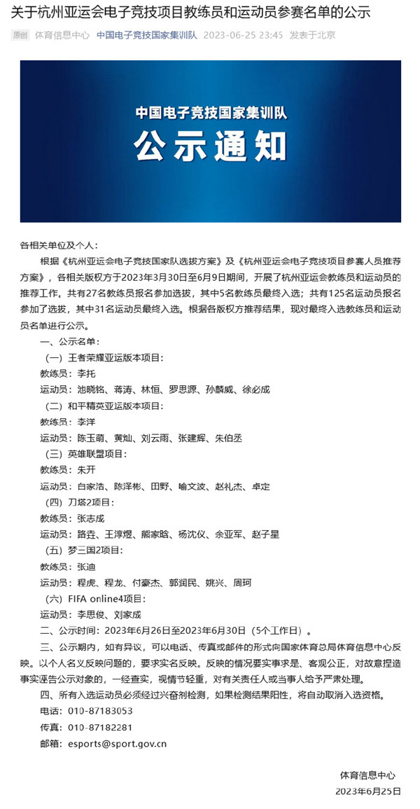 各位王者荣耀的玩家和粉丝们最近最关注的杭州亚运会的中国队最终大名单终于确认了,王者荣耀项目最终确认李托(职业ID:奶茶)为中国队教练员,运动员分别为池晓铭(职业ID:Ming)、蒋涛(职业ID:阿豆)、林恒(职业ID:暖阳)、罗思源(职业ID:花海)、孙麟威(职业ID:坦然)、徐必成(职业ID:一诺)。