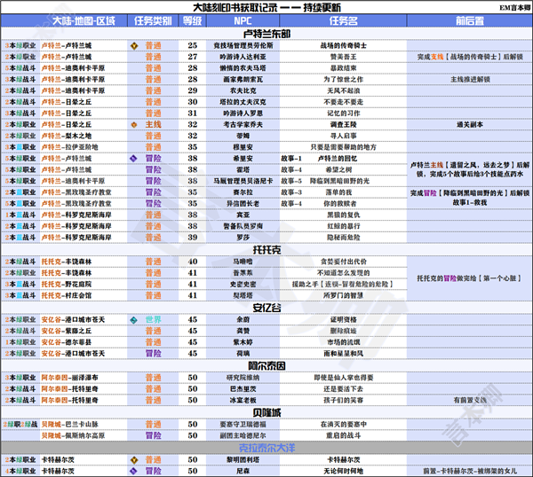 主要是通过各个区域的任务来获取到大陆刻印书,部分任务需要完成前后置。对应的分布区域、等级、NPC和任务名称都放在下面了。有需要的小伙伴自取即可。