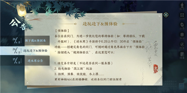 逆水寒手游近期已经开放了预下载和角色创建,人气非常火爆,不知道有多少小伙伴已经完成角色创建了。在公测前,官方还会临时开放预体验,能让完成预创角的玩家提前进入游戏体验。不过很多小伙伴不知道这个预体验的时间是什么时候,我今天就来和大家分享一下。