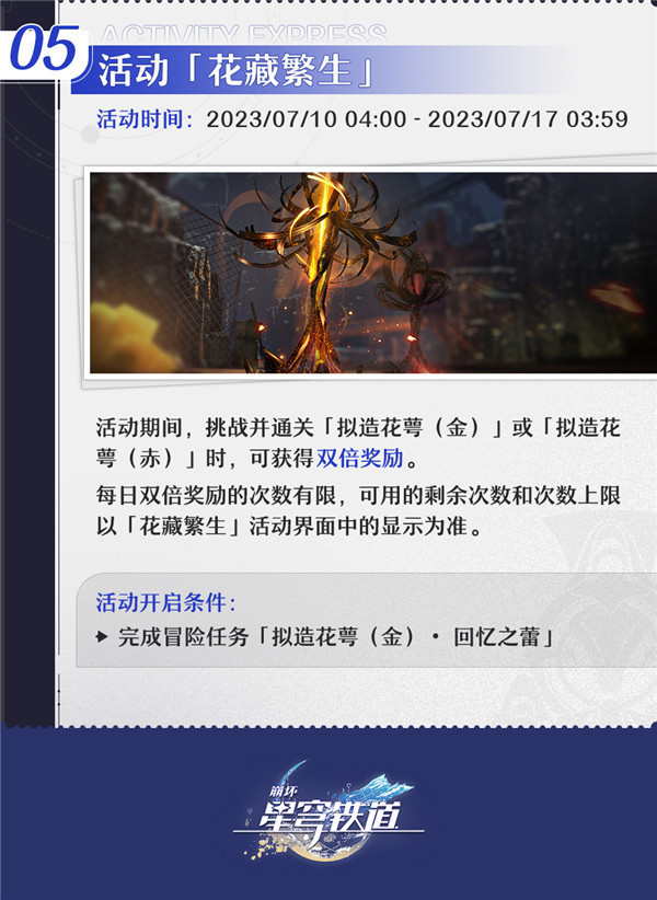 活动期间,挑战并通关拟造花萼(金)或拟造花萼(赤)时,可获得双倍奖励。
