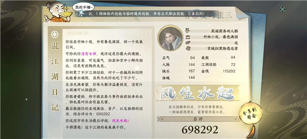 手游中的混江湖一共有三个环节。第一个环节我们选择roll自己的初始属性,第二个是0-18岁的成长,第三个便是在汴京开混。汴京有7天的时间限制,7天后自动结算。
