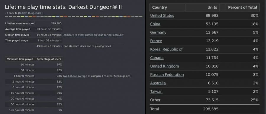 《暗黑地牢2》(Steam)游玩统计与各国销量