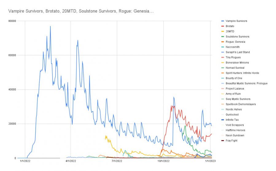 《吸血鬼幸存者》依旧是品类中的王者,2022年10月推出正式版、12月推出DLC时玩家峰值远超同类;