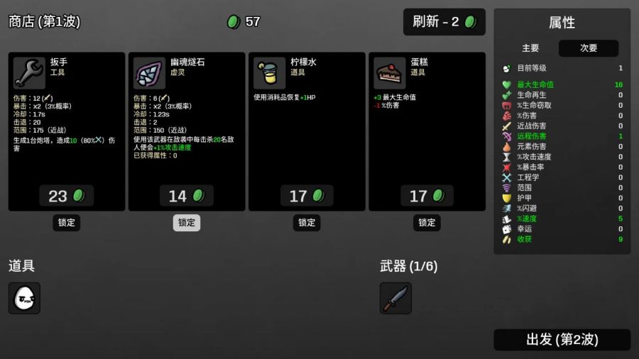《土豆兄弟》对模板的修改更为激进一点。第一,它修改了游戏规则,一局游戏被拆分成了20个波次,波次时长从最开始的20秒增加到关底的90秒,基于此,游戏地图被框在了一个更小的范围内,敌我移动速度增加;第二,它将破敌后的战利品掉落拆分成经验值与金钱,进而在每个波次结束后引入商店,经验值对应角色能力提升,金钱购买武器或道具。