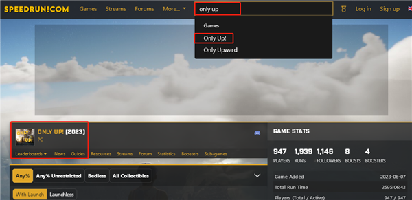 2、进入Speedrun,在最上方的搜索栏输入“only up”,选择第二行的选项,即可进入游戏对应板块。
