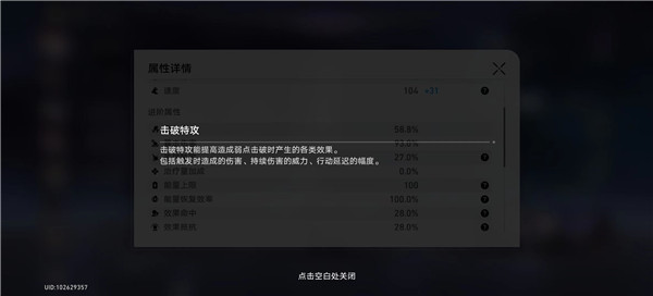 1是我方全体击破特攻增加100%。击破特攻影响的是角色击破敌人带来的击破状态触发时带来的伤害、后续持续伤害的威力和行动延迟的幅度。