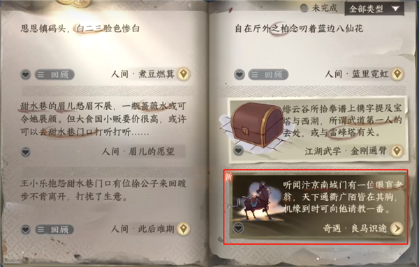 2、当我们的熟识度超过70点,就会概率在汴京城内,不限具体地点触发奇遇-“老马识途”。我的号是在酉时触发的。