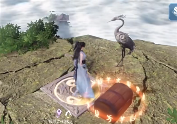 3、然后去下一座山峰(1206.791),在山峰顶观察仙鹤雕像触发“裂土”。接下来去到半山腰(1206,792)使用望气搜索,能够找到一块发光黄色岩石,用技能击破岩石,并开启宝箱,即可完成任务。