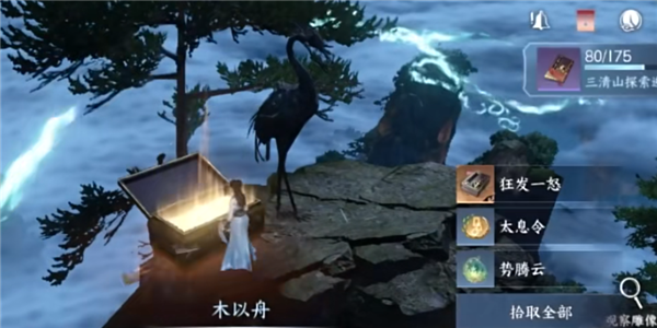 2、在第一座山峰(1181.731)观察仙鹤雕像后会触发“断木”,注意树旁边的宝箱,要用火烧打开宝箱然后完成任务。