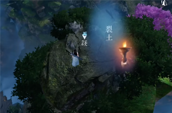 三、然后去下一座山峰(1206.791),在山峰顶观察仙鹤雕像触发“裂土”。接下来去到半山腰(1206,792)使用望气搜索,能够找到一块发光黄色岩石,用技能击破岩石,并开启宝箱,即可完成任务。