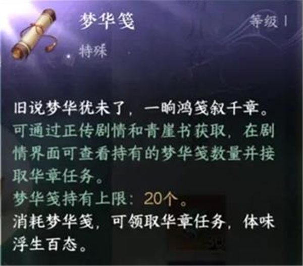 接取红尘行歌任务需要道具-梦华笺,这个道具可以通过青崖书日课点奖励或者主线剧情奖励获得,最高持有20个。