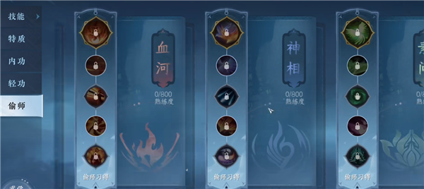 3、每个流派都有五类技能可以偷师,全部偷学的话需要消耗5次副本次数,也就是两周半的时间。建议是先偷满一个流派的所有技能特质之后再去偷下一个。