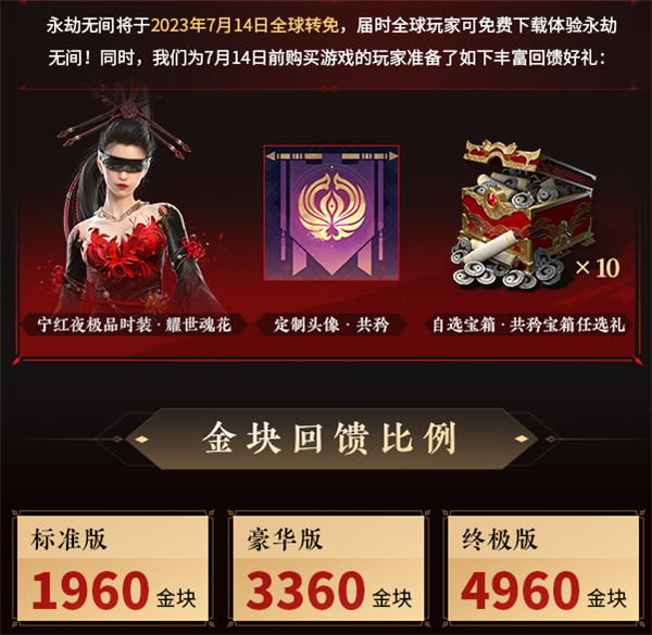 而针对7月14日前付费购买游戏的老玩家,官方将送出宁红夜极品时装·耀世魂花、定制头像·共矜和自选宝箱*10,还是非常有诚意的。并且针对不同购买版本的老玩家,还将返还金块,金块主要用于购买游戏内道具。标准版返还1960金块,豪华版3360,终极版4960。